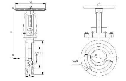 手动刀型闸阀的构造图及主要外形及连接尺寸(mm):